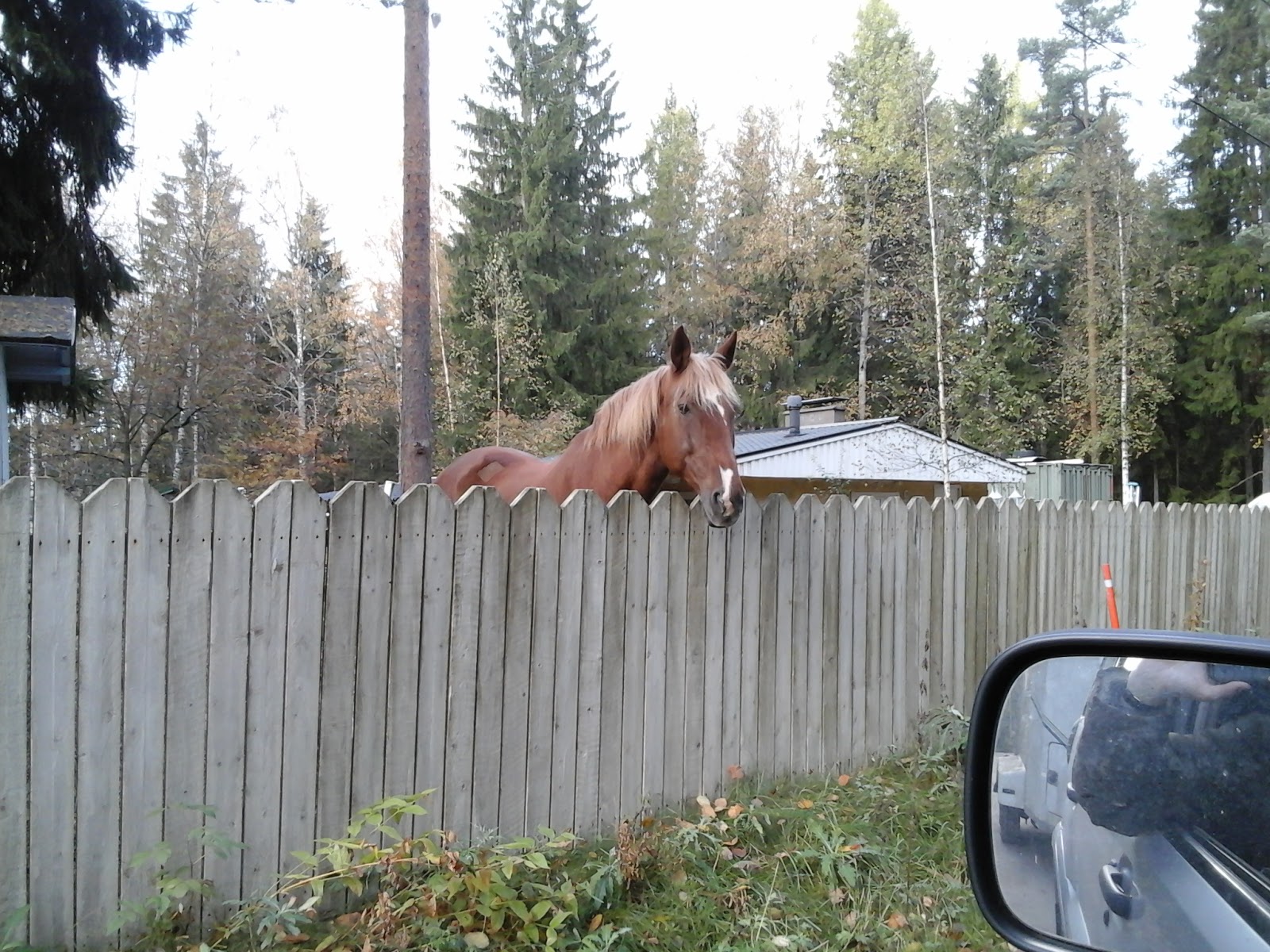 Kuvan hevonen on tottunut liikenteeseen ja tervehtii aidan yli kotiin palaavaa palveliaansa.